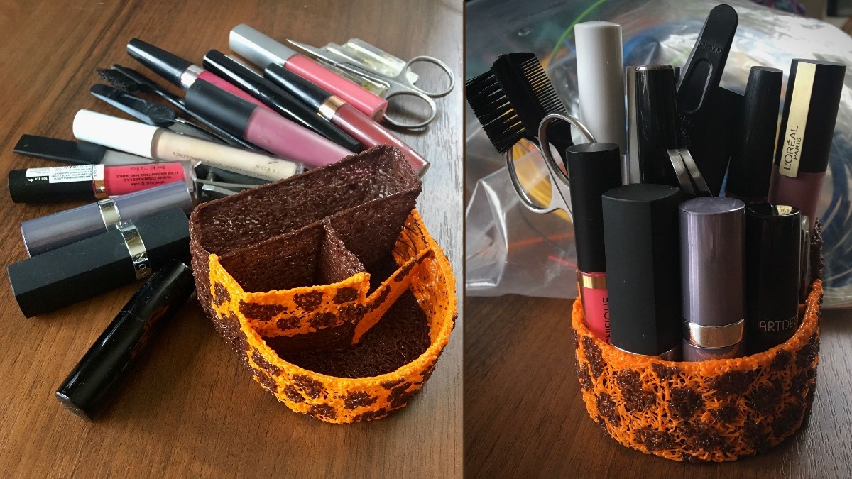 Не перестаю восхищаться 3d-ручкой как инструментом для творческого решения бытовых задач! Вот смотрю на эти два снимка и удивляюсь: как такое количество необходимых под рукой мелочей удобно разместилось на минимально возможной площади?! А всё потому, что органайзер был спроектирован и нарисован для конкретных предметов и места на подзеркальнике. На листочке в клеточку я нарисовала план (он же вид сверху на будущий органайзер). Прикинула длину и ширину высокого заднего отделения для блесков для губ, пилки для ногтей и других вещей похожего размера - на плане появился соответствующий прямоугольник. Потом провела закруглённую линию, замыкающую контур будущего донышка. Поставила вдоль неё губную помаду, чтобы понять, где делать стенку для средних отделений. В середине собиралась держать тяжёлые, но плоские предметы: маникюрные ножницы, кусачки, поэтому одно большое отделение в проекте разгородила на два маленьких. Всё! Используя полученный шаблон, нарисовала 3d-ручкой донышко органайзера,