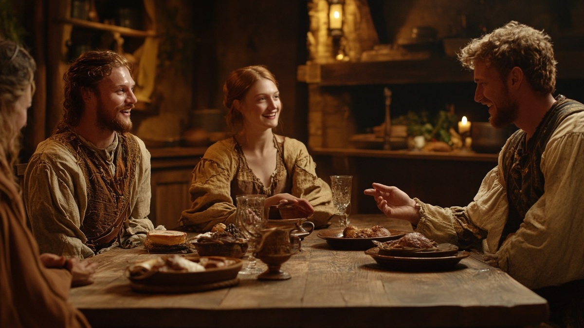 Создано на основе запроса: realistic photo of men and women in midieval outfits talking with each other at a wooden dinner table in a stine