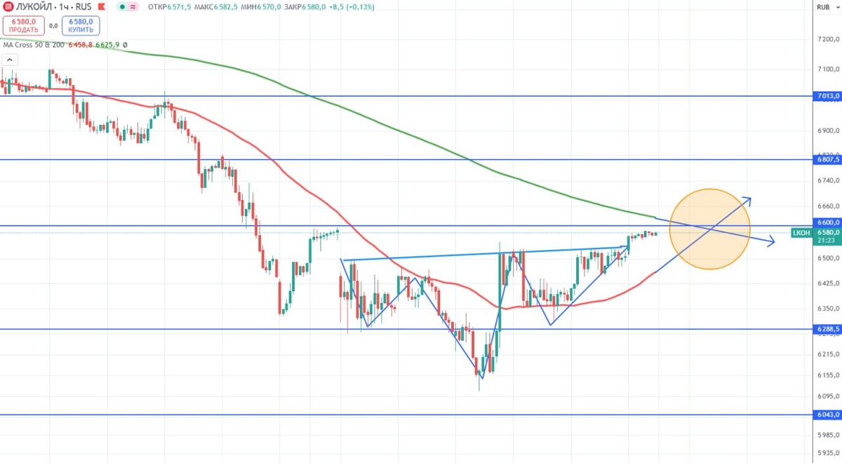 💬 Текущая ситуация на рынке: актуальные точки входа На текущий момент по многим инструментам наблюдаются позитивные сигналы, включая паттерны разворота тренда. Особое внимание заслуживает фигура «Голова и плечи» , которую мы ранее анализировали на примере акций НЛМК. Напоминаю, что данный паттерн успешно сработал, однако важно помнить: ни один паттерн не гарантирует 100% результат. На динамику рынка влияют геополитические риски и другие внешние факторы. 🔥 Нефтяной сектор: #LKOH и #ROSN В фокусе — бумаги нефтегазового сектора. На 4-часовом и часовом таймфреймах акции $LKOH и $ROSN демонстрируют схожую техническую картину. Дополнительным сигналом для покупок может стать формирование ➕«Золотого креста» — пересечение скользящих средних MA-50 и MA-200 на часовом графике. ✔️ Для подтверждения восходящего тренда ключевым уровнем станет пробой и закрепление цены выше MA-50 (зеленая линия на графике). Рекомендуем дождаться подтверждения сигнала перед входом. Выбор за вами! #Обзор #Аналити