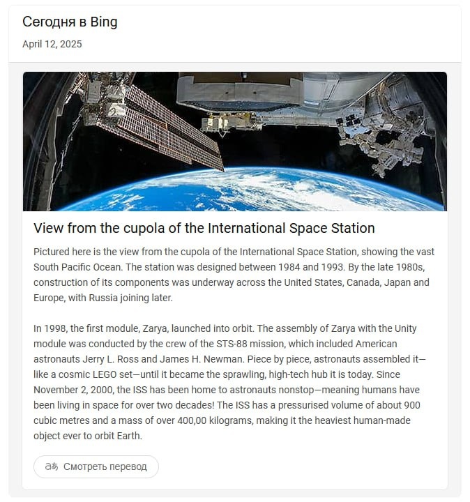 На снимке изображен вид с купола Международной космической станции, показывающий обширную южную часть Тихого океана. Станция была спроектирована в период с 1984 по 1993 год. К концу 1980-х годов его компоненты велись в США, Канаде, Японии и Европе, а позже к ним присоединилась и Россия.