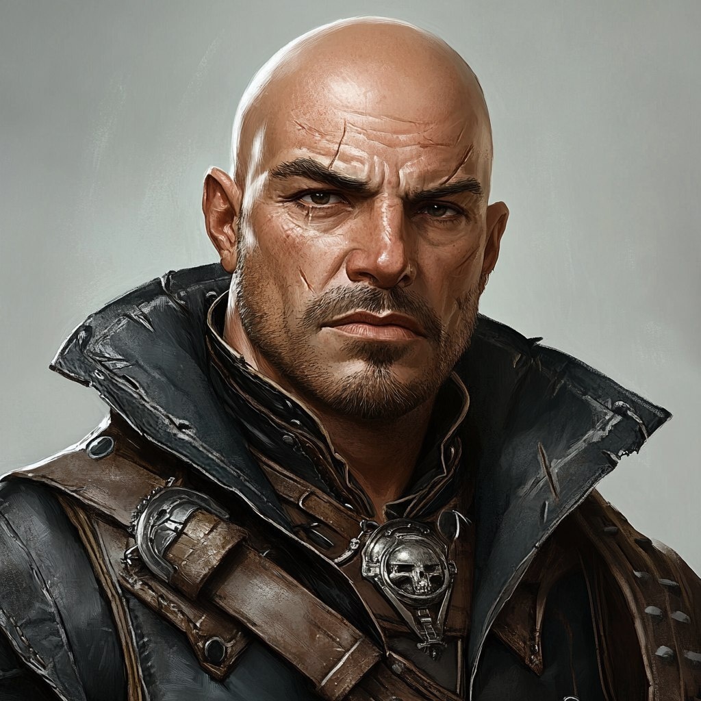 Создано на основе запроса: pirate man, no facial hair, bald, broad nose, wearing leather armor, d&d style, fantasy setting