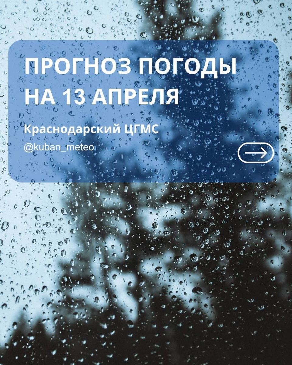 🌧️ Прогноз погоды в Краснодарском крае на 13 апреля. Актуальный прогноз с 18:00 12 апреля до 18:00 13 апреля по всемирному скоординированному времени (UTC). 🌊 На Черноморском побережье: Переменная облачность. Ночью и утром местами небольшой дождь, днём без осадков. 💨 Ветер восточной четверти 6-11 м/с. • Местами порывы до 13 м/с. 🌡️ Температура воздуха: Прогноз от @kuban_meteo