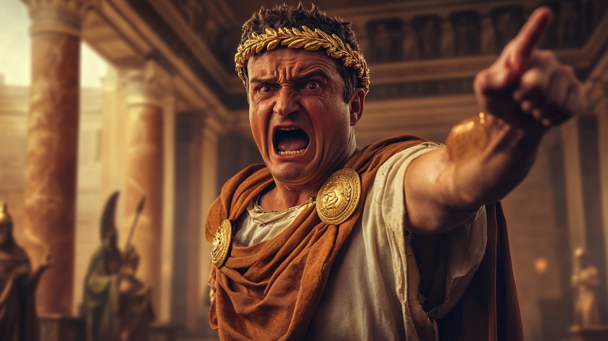 Создано на основе запроса: A dramatic and furious Roman emperor Augustus, with a bright red face, angrily pointing his finger as he shouts a