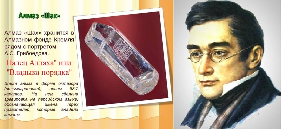 Венцом подношений был великолепный алмаз, идеально прозрачный отшлифованный по граням октаэдра бриллиант массой 88,7 карата, наречённый «Перст Аллаха». На нём была выполнена гравировка восточной вязью «Владыка порядка» и три имени прежних владельцев солитёра. Когда-то он украшал трон Великих Моголов в Индии, потом стал гордостью и достоянием персидских шахов. В настоящее время хранится в Алмазном фонде в Москве под названием «Шах». По величине и ценности в Российской коллекции его превосходит только бриллиант «Орлов» - 199,6 карат. Алмаз огранён в форме «индийской розы», имеет 180 граней который был инкрустирован в скипетр – символ Российской власти. Екатерина II, якобы, получила его в дар от своего фаворита, который купил драгоценность у армянского купца в Европе.