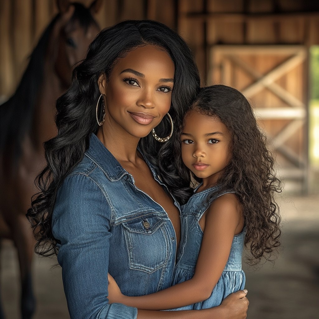 Создано на основе запроса: create a clear realistic photo of an african american mother in her 30's. she is wearing a jean dress. she has long wavy hair. big hoop earrings. she is hugging her 7 year old daughter. they are standing in front of a barn. a horse is in the background. 8k. high resolution --- Автоперевод: Создайте четкую реалистичную фотографию афроамериканской матери в ее 30 -х годах. Как тебе генерация? 🤔 https://dzen.ru/id/65c0c65c86e4f837c27b24d7 #ИИ #AI #нейросеть #midjourney #art