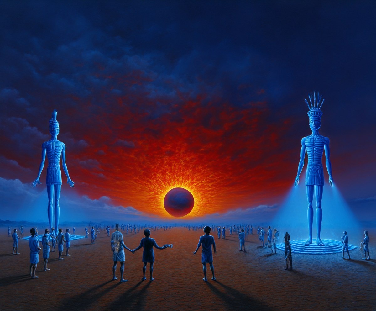Создано на основе запроса: A dramatic scene depicting the Anunnaki (ancient deities) descending from Nibiru to early Earth. Their advanced forms tower over primitive humans who regard them with awe. Create a stark contrast between the sophisticated, luminous beings and the earthbound humans, with a massive red planet visible in the sky above. Use lighting to suggest a transfer of knowledge or power --- Автоперевод: Драматическая сцена, изображающая Ануннаки (древние божества), спускающиеся от Нибиру к ранней земле. Необычно получилось? 🤔 https://dzen.ru/id/65c0c65c86e4f837c27b24d7 #ИИ #AI #нейросеть #midjourney #art