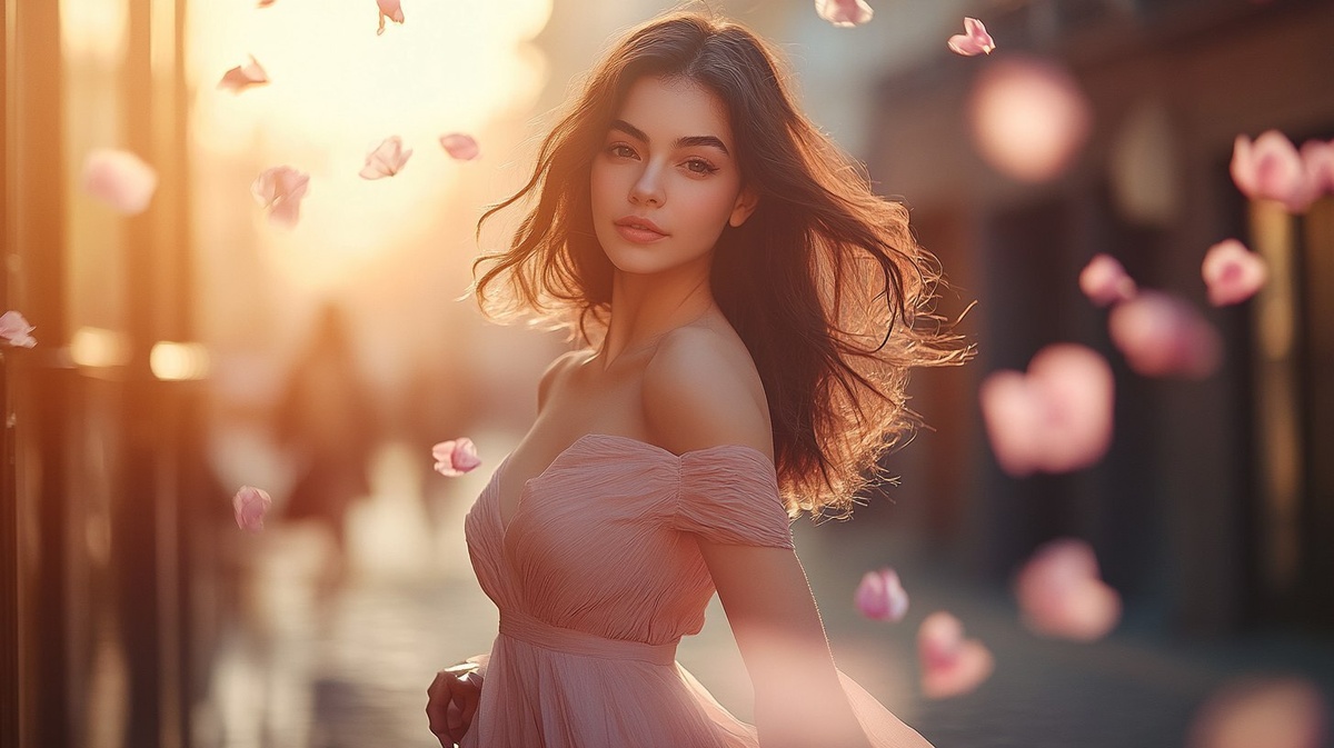 Создано на основе запроса: A stylish woman confidently walking down a Parisian street at golden hour, soft pink petals floating in the air, light reflecting off boutique windows, wearing a blush dress and heels, head held high, cinematic glow, elegance in motion, soft bokeh background