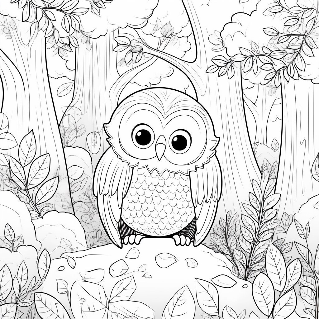 Создано на основе запроса: Adorable cartoon owl in a magical forest, a black and white Pixar-style coloring illustration. The bear should have a round body, a friendly smile, and big eyes, with an adorable and cuddly appearance. The scene takes up the entire page, without a border, and features simple woodland elements like trees, bushes, and butterflies, all drawn with very defined outlines. Designed for coloring in a book for children ages 3 to 5. The background is clean white, uncolored, with no shading or border.