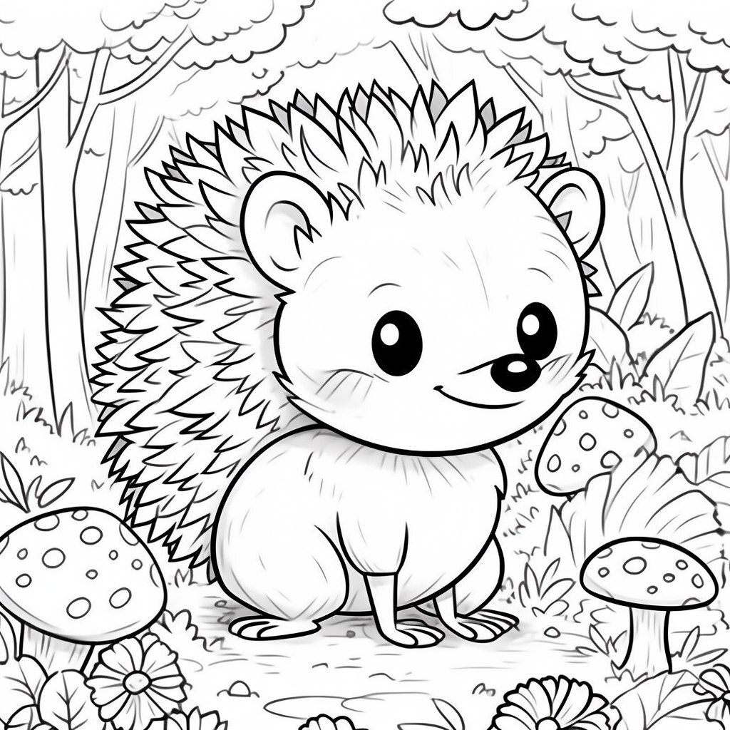 Создано на основе запроса: Adorable cartoon hedgehog, black and white Pixar-style coloring illustration