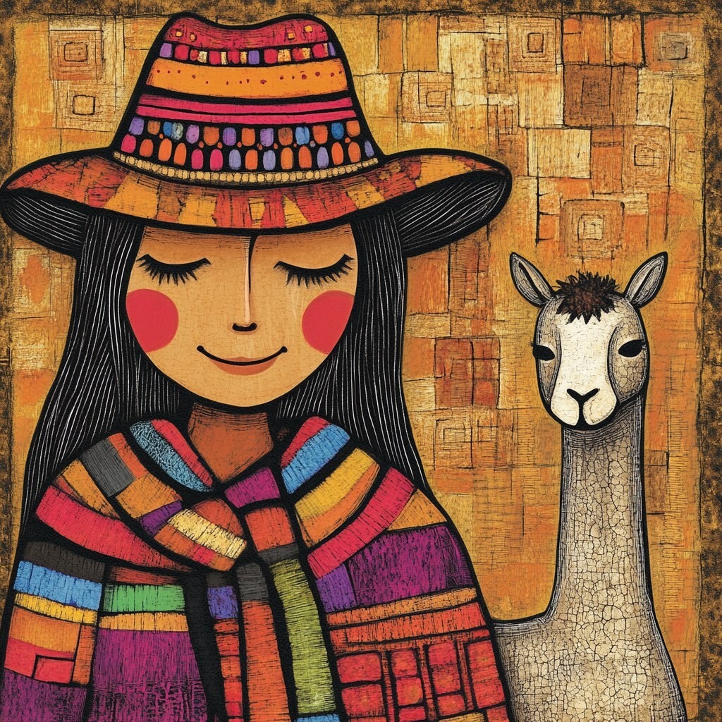 Создано на основе запроса: Indigenous Ecuadorian woman in traditional dress, with Andean hat and colorful poncho and a llama, magnet style, hand-painted texture inspired in Guayasamin, bold black lines, warm color palette (ochre, red, brown), simplified face with closed eyes, expressive --- Автоперевод: Эквадорская женщина в традиционном платье, с андской шляпой и разноцветным пончо и ламой, магнитом, росписью вручную текстуру, вдохновленную гуаясамином, смелыми черными линиями, теплой цветовой палитрой (охрой, красная, коричневая), упрощенное лицо с закрытыми глазами, выразительные Как тебе эта иллюстрация? 🤔 https://dzen.ru/id/65c0c65c86e4f837c27b24d7 #ИИ #AI #нейросеть #midjourney #art