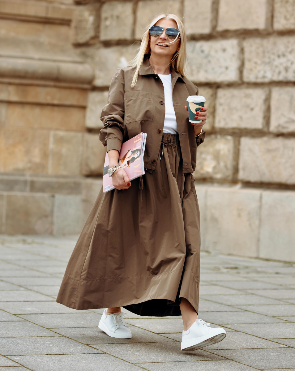 Спорт-шик – философия комфорта, но в ней есть место женственности! Ниже мы видим еще один весенний сет с юбочным костюмом, который можно смело носить как с кроссовками, так и с кедами.