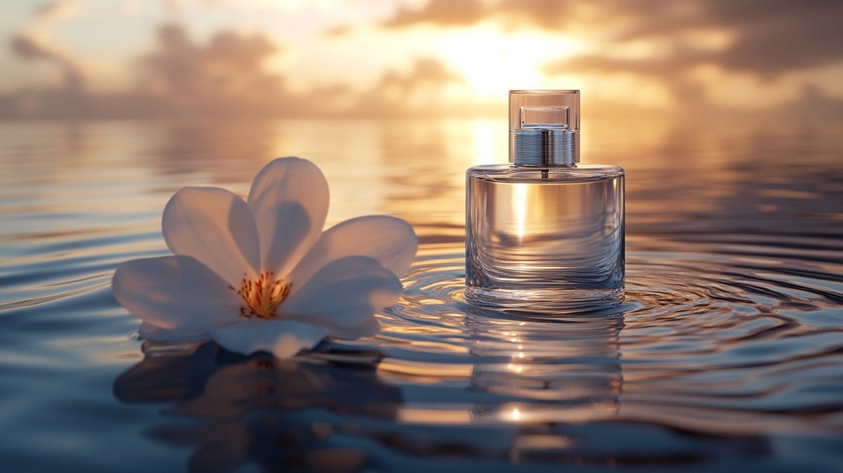 Создано на основе запроса: White plain perfume bottle gently resting on a floating orchid petal over calm water, ripples forming around it