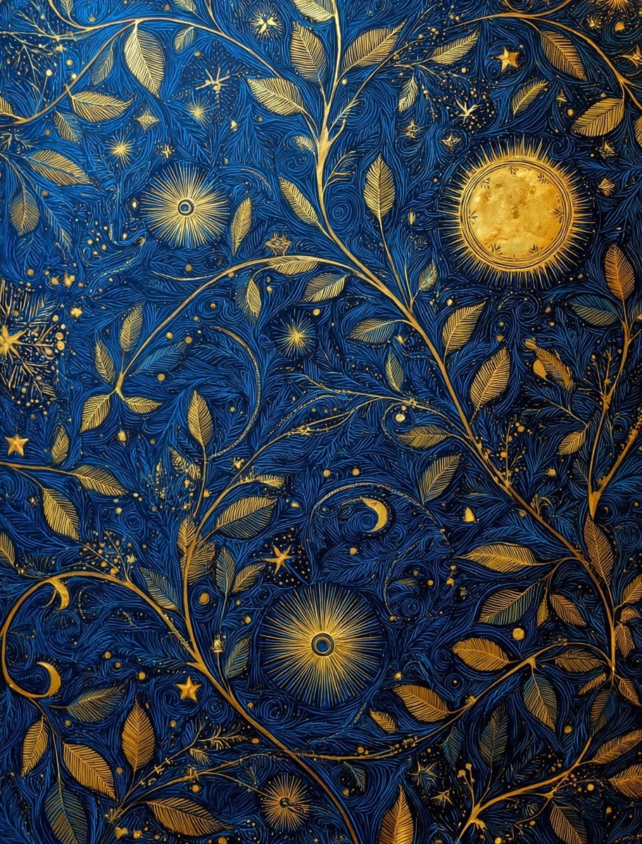 Создано на основе запроса: celestial tapestry depicting the night sky, with stars and moons interwoven into intricate patterns of vines and leaves. Nibiru is a golden orb against an indigo background, casting long shadows on the starry canvas. In hues of midnight blue, gold accents highlight each element in shimmering detail. This detailed artwork captures cosmic beauty through meticulous line work and delicate shading. --- Автоперевод: Небесный гобелен, изображающий ночное небо, со звездами и лунами, переплетенными в замысловатые узоры лоз и листьев. Интересно выглядит? 🤔 https://dzen.ru/id/65c0c65c86e4f837c27b24d7 #ИИ #AI #нейросеть #midjourney #art