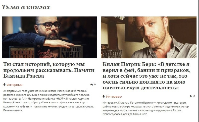 #анонс На страницах апрельского выпуска журнала DARKER в рубрике «Тьма в книгах» читателей ждут следующие материалы: — Некролог о Баязиде Рзаеве, бывшем главном редакторе журнала DARKER. Коллеги и друзья поделились светлыми воспоминаниями о рано ушедшем филологе, редакторе, исследователе философии, хоррора и нуара. — Интервью с Киланом Патриком Берком — ирландским писателем, работающим в жанре хоррора, темного фэнтези и детектива. Автор впервые дал эксклюзивное интервью для аудитории в России. Побеседовала Надежда Гамильнот. — Рецензия на роман «Университет» Бентли Литтла. — Рецензия на сборник «Знаток: узы пепла» Германа Шендерова и Сергея Тарасова. — Рецензия на роман «Потапыч» Павла Беляева. — Рецензия на авторский сборник «Шах и мат» Джозефа Шеридана Ле Фаню. — Рецензия на роман «Желание покоя» Джозефа Шеридана Ле Фаню. Новый номер выходит традиционно в ночь с 19 на 20 число. Ждите! И, кстати, напомним, что спонсоры на Бусти могут все это и многое другое прочитать уже сей