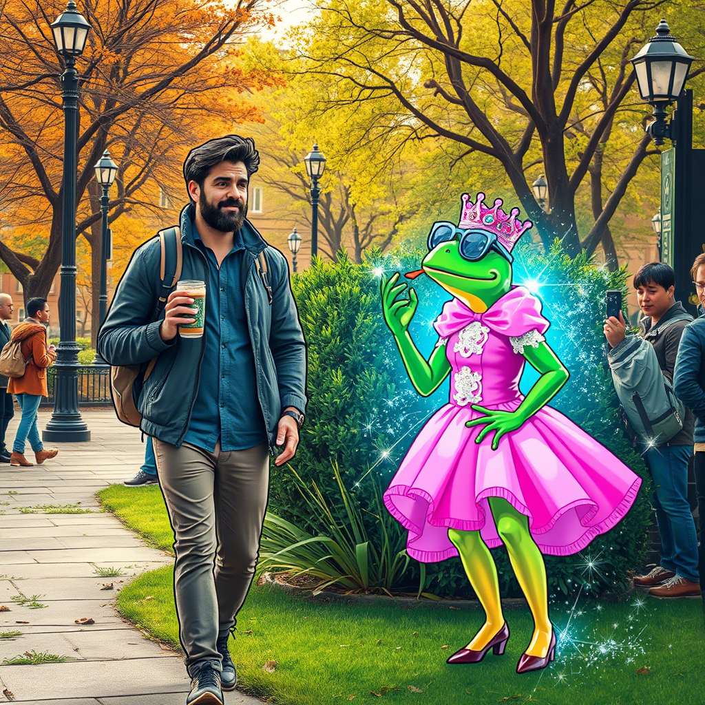 Однажды гуляет Рома по парку с колдбрю в руке, слушает подкаст про осознанность — и вдруг из кустов прыгает лягушка. Не простая, а в очках Versace и с рюкзаком-«лягушкой» от Balenciaga. Говорит: