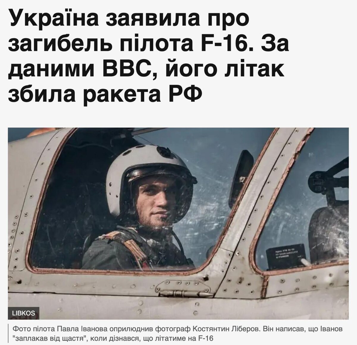 По данным BBC, украинский F-16, пилотируемый Павлом Ивановым, был сбит российской ракетой. Три выстрела — либо с наземного комплекса С-400, либо ракета "воздух-воздух" Р-37 — уничтожили "непобедимый" самолёт.