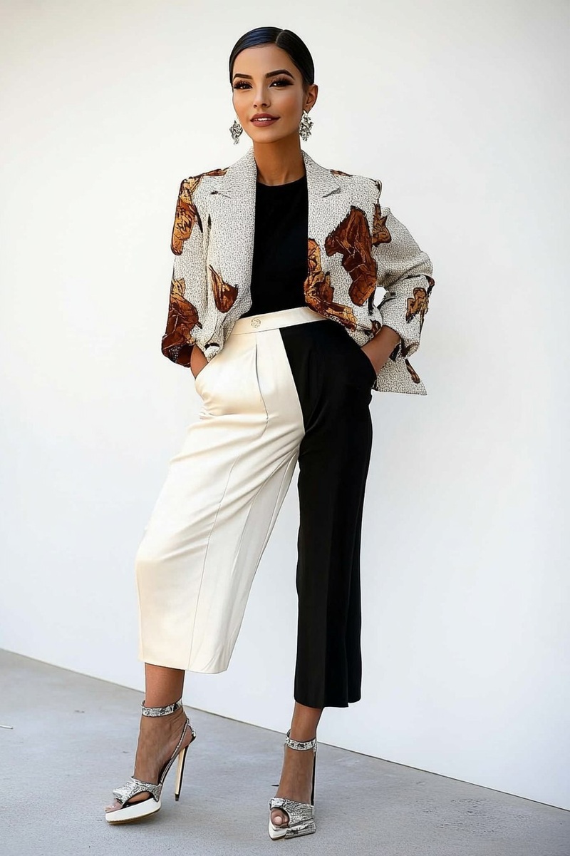 Создано на основе запроса: standing black model pants and jacket, loose long, silky fabric, high heeled shoes she has short pixie haircut