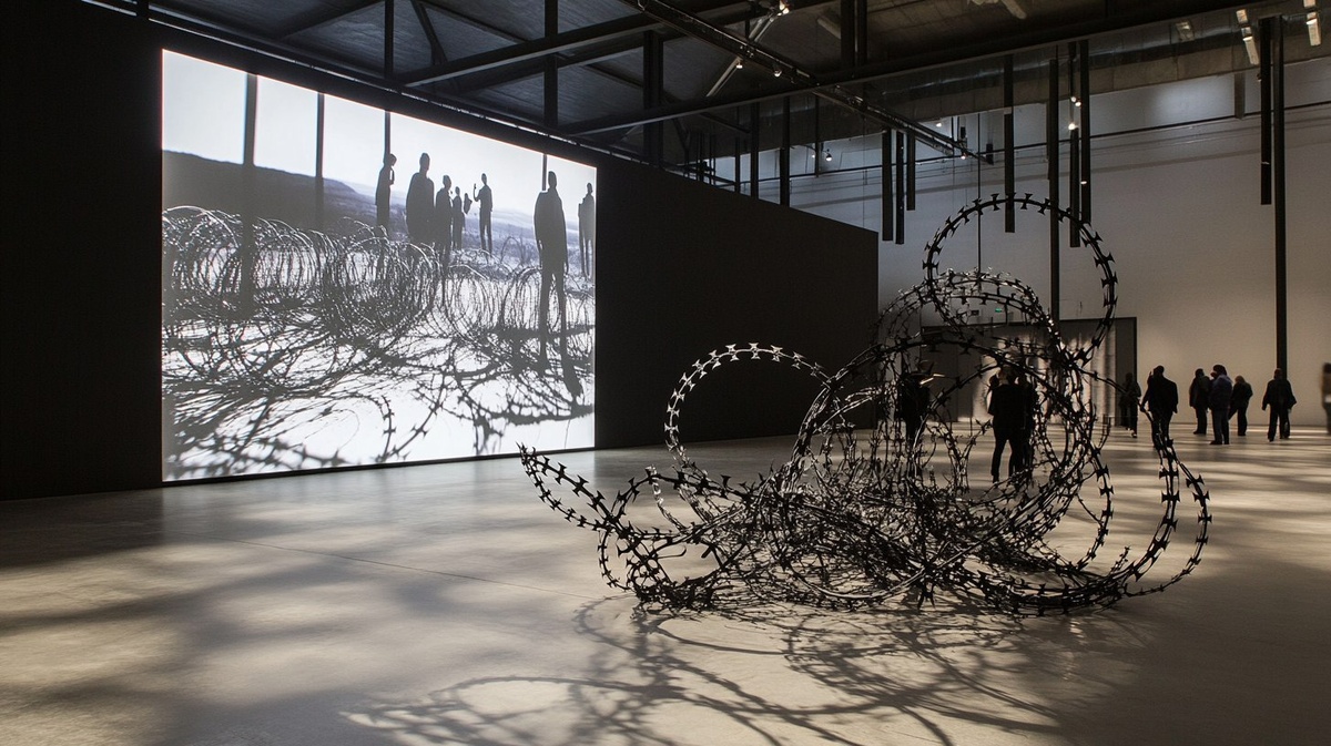 Создано на основе запроса: A contemporary indoor art installation in a modern exhibition hall . In the center is a 4 meter by 3 meter standalone wall with a film projected on it, the film is showing a black and white desert, on the ground in front of the screen-wall is large tangled mass of barbed wire on the ground. The barbed wire is coiled like a border and the metal is brushed . The installation casts intricate, sharp-edged shadows on the concrete floor, creating a striking contrast between order and violence. The place is characterized by a wide industrial art space, limestone pavement tiles, modern architectural buildings, and scattered people walking around, some stopping to observe. The mood is contemplative and eerie, evoking themes of containment, restriction, migration and hidden suffering. --- Автоперевод: Современная внутренняя художественная инсталляция в современном выставочном зале. Хорошо вышло? 🤔 https://dzen.ru/id/65c0c65c86e4f837c27b24d7 #ИИ #AI #нейросеть #midj