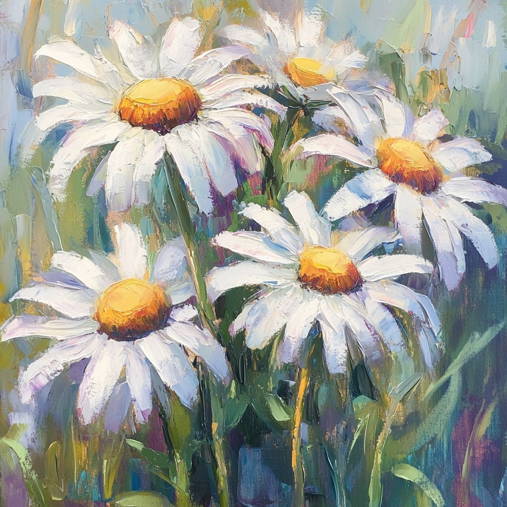 Создано на основе запроса: create a very loosely painted lively brush work painting of Oxe Eyed daisies