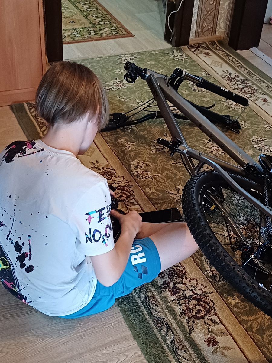 В парке праздник ко Дню Космонавтики начался, но идти туда у меня сил уже не было. Дети тоже не пошли, им концерт не интересен. Арина сразу унеслась обкатывать обновку. Алеша уговорил меня открыть коробку со своим велосипедом. Хотели зарплаты дождаться и попросить кого-то собрать за денежку, а он все вытащил, поковырялся с час и сам все собрал. Телефон разрывается, во дворе орут "Лехааа", а он сидит, собирает. Потом сходил на шиномонтажку, там ему колеса подкачали, сказали, что все в порядке. Велик взрослый, тяжеловат, немного, но Алешка справился. Пусть ноги качает. Арине надо будет поменьше и полегче подобрать.