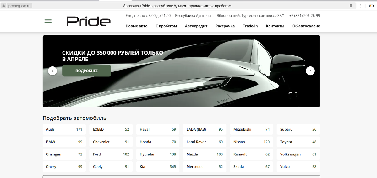 Pride (Прайд Моторс) — это автосалон в Адыгеи. Торгует новыми и подержанными авто, обещает низкую цену, которая не подтверждается документально. Владелец больше похож на подставное юрлицо, а в сети много поддельных положительных отзывов. Автосалон Pride находится в Адыгеи (пгт Яблоневский), в нем можно купить как новый, так и подержанный автомобиль. В каталоге представлено более 20 марок. Официального дилерства у салона нет. Новые автомобили продаются с большими скидками. Вот пример цен на модельный ряд Lada: В реальности данные автомобили стоят более 1 000 000 рублей. С чем связаны скидки, превышающие 50% от стоимости авто, не понятно. Да и публичной оферты на сайте нет, следовательно, нет и оснований верить в это предложение. К автомобилям с пробегом, которые продаются в автосалоне Прайд Моторс (Адыгея), тоже большие вопросы. Во-первых, нет никаких гарантий, что на фото представлены именно те авто, которыми располагает салон: фотографии сильно отфотошоплены, изображения авто могли вз