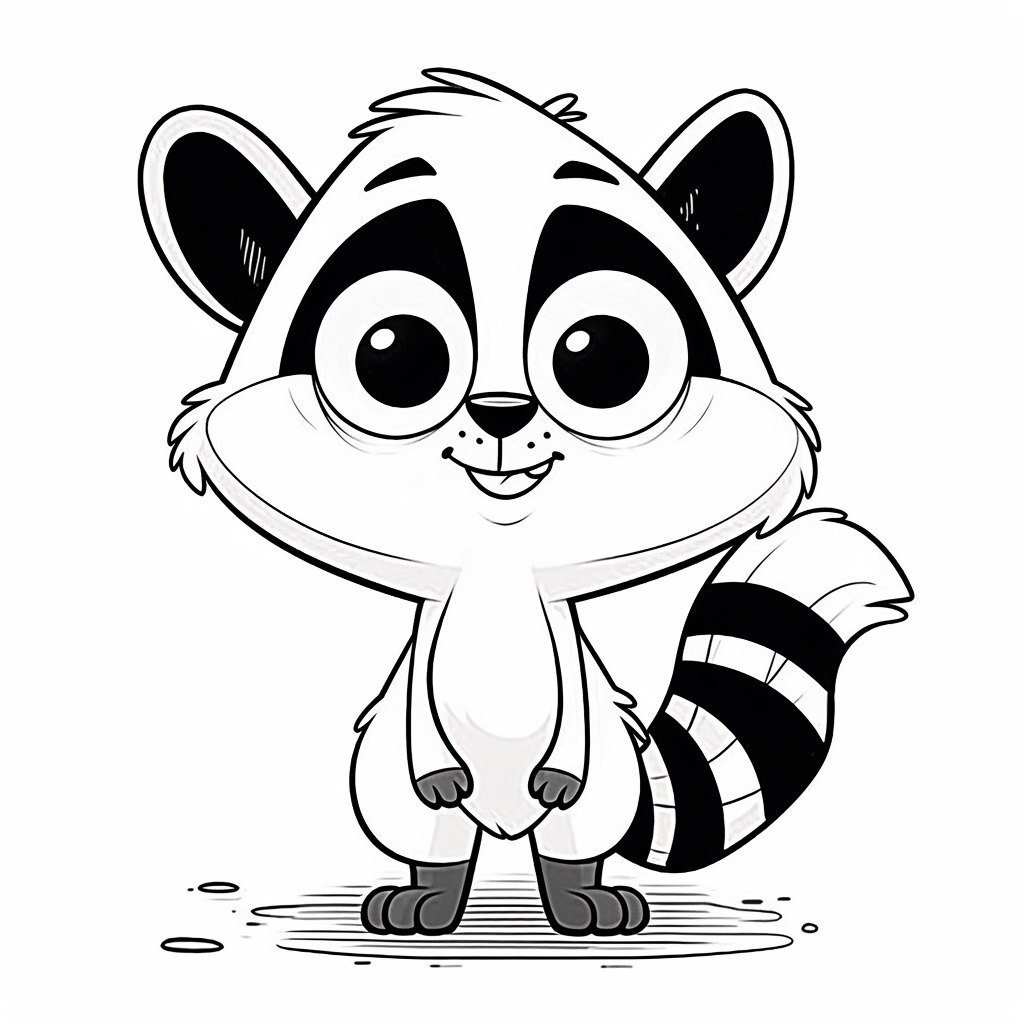 Создано на основе запроса: Adorable cartoon raccoon, black and white Pixar-style coloring illustration