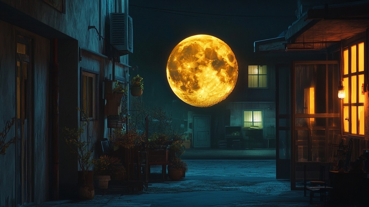 Создано на основе запроса: through a window we see the moon landed in a street, interior house, dusk, cinematic, illumination