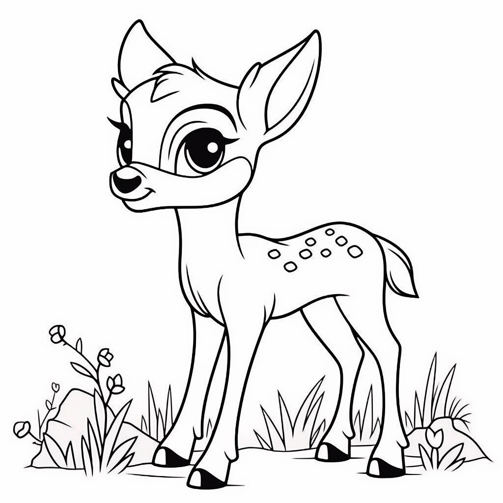 Создано на основе запроса: Adorable cartoon deer, a black and white Pixar-style coloring illustration
