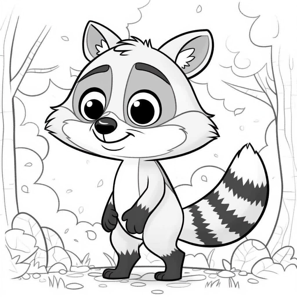 Создано на основе запроса: Adorable cartoon raccoon, black and white Pixar-style coloring illustration