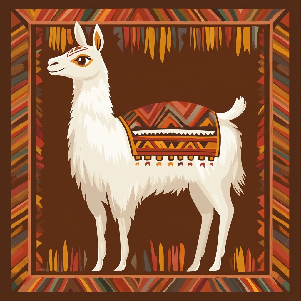 Создано на основе запроса: Ecuadorian white llama in traditional andean setting, stylized design inspired by wood-carved souvenir magnets