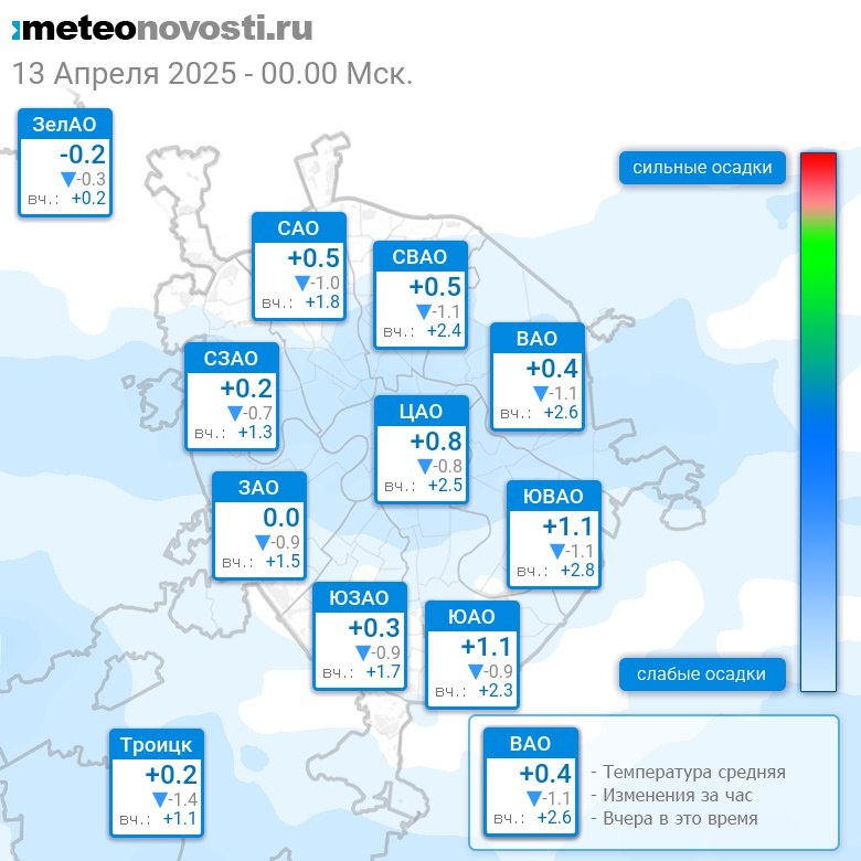 В 0:00 в Москве было от -0.9°C до +1.7°C, средняя температура +0.5°C #погода #Москва #весна #температура #13апреля #воскресенье