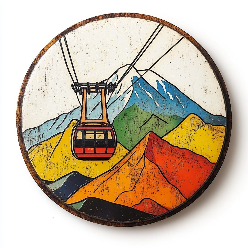 Создано на основе запроса: Quito cable car (Teleférico) ascending above stylized Ruco Pichincha 3 mountains, color-full palette, bold black outlines, wooden hand-painted souvenir round magnet style, simplified minimalist Ecuadorian design --- Автоперевод: Канатная дорожка Quito (Teleférico) поднимается над стилизованными горами Ruco Pichincha 3, цветовой палитрой, жирными черными очертаниями, деревянным сувенирным сувенирным стилем магнита, упрощенный минималистский эквадорский дизайн Круто вышло? 🤔 https://dzen.ru/id/65c0c65c86e4f837c27b24d7 #ИИ #AI #нейросеть #midjourney #art