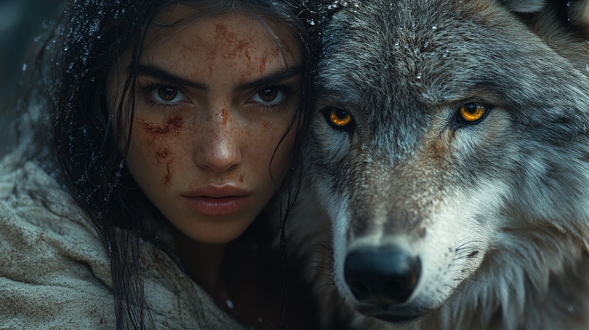 Создано на основе запроса: a women transofrming into a wolf, cinematic scene