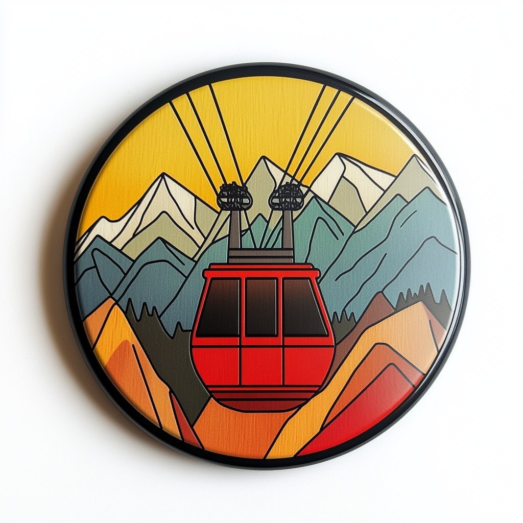 Создано на основе запроса: Quito cable car (Teleférico) ascending above stylized mountains, color-full palette, bold black outlines, wooden hand-painted souvenir round magnet style, simplified minimalist Ecuadorian design
