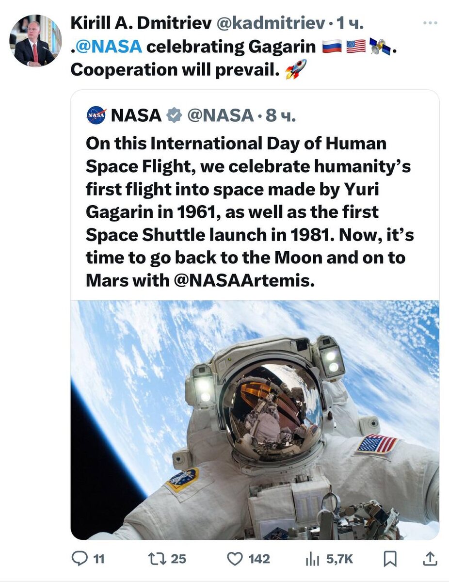 Глава РФПИ Кирилл Дмитриев в ответ на публикацию заявил, что сотрудничество США и РФ в космической сфере восторжествует.