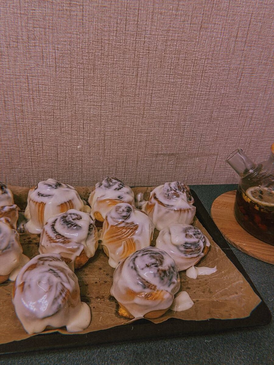 Сегодня эстетика ушла на второй план, уступая свое место невероятно крутому вкусу. 🥐Название этого десерта «Ленивые синнабоны». И как вы уже могли догадаться «ленивые» они потому, что очень просты в приготовлении, а самое главное не отнимут много вашего времени. 🥐Для булочек: Тесто слоенное дрожжевое - 500г Сахар - 5 ст.л. Корица - 2 ст.л. Сливочное масло (растопленное) - 30г 🥐Для крема: Творожный сыр - 150г Сахарная пудра - 100г Молоко - 2 ст. л. (по необходимости можно добавить больше) 🥐Предварительно размороженное слоёное дрожжевое тесто раскатываем в пласт, смазываем растопленным сливочным маслом и посыпаем сахаром и корицей. Затем аккуратно сворачиваем в тугой рулет. Режем рулет на одинаковые кусочки. 🥐На дно формы для выпекания или на противень кладём пергаментную бумагу. Выкладываем наши будущие булочки на расстоянии друг от друга (они станут в 2-3 раза пышнее в процессе приготовления). Ставим на расстойку в тёплое место на полчаса. 🥐Взбиваем миксером сыр,сахарную пудру и