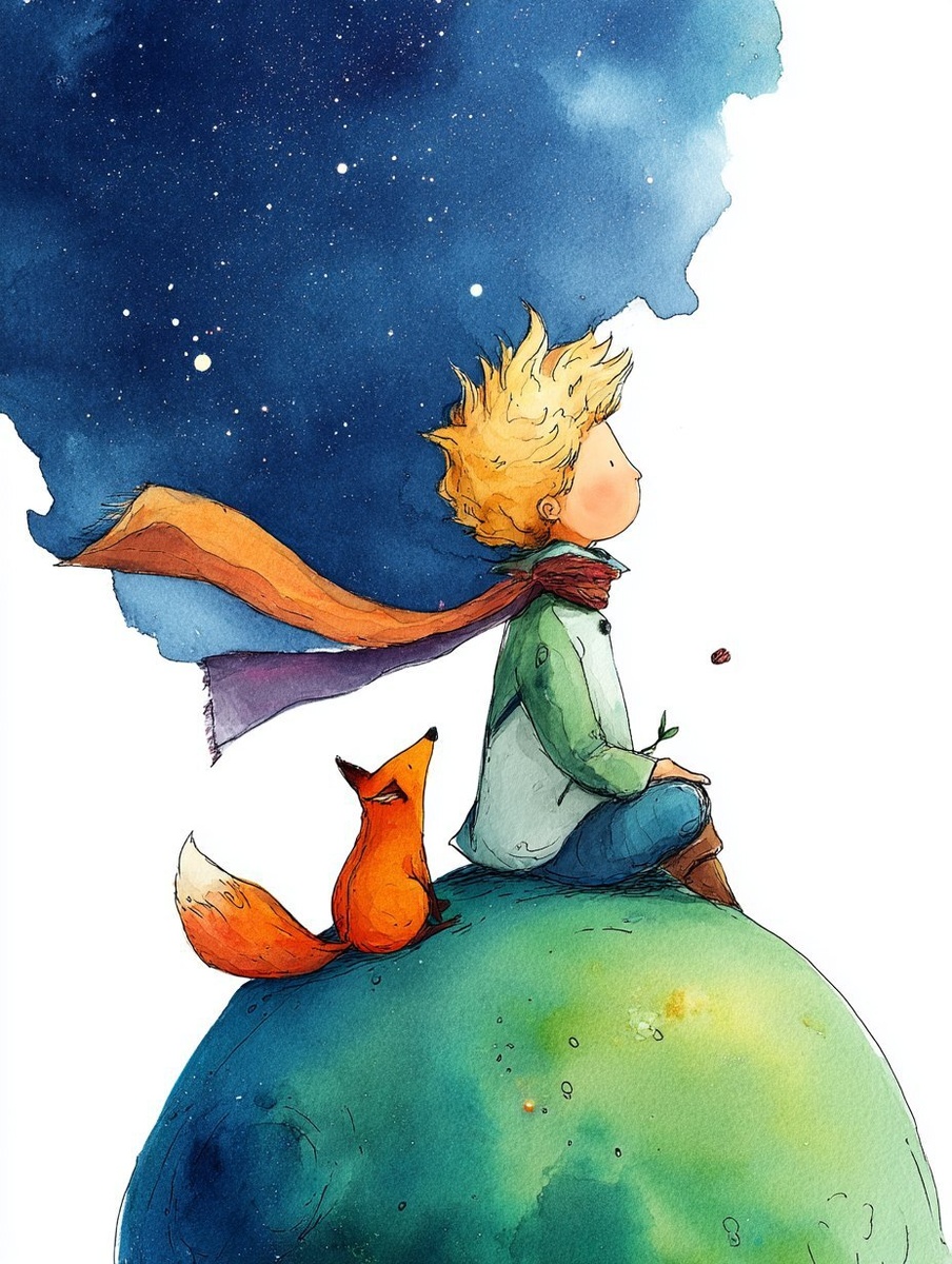 Создано на основе запроса: the little prince sitting on his little nibiru planet, with a little red fox, he looking to a rose in the dome