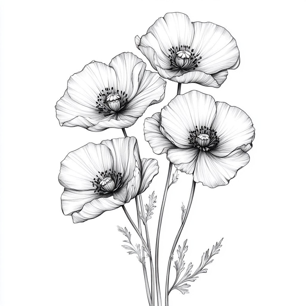 Создано на основе запроса: black and white fine line illustrative drawing of poppy flowers in style of a tattoo design