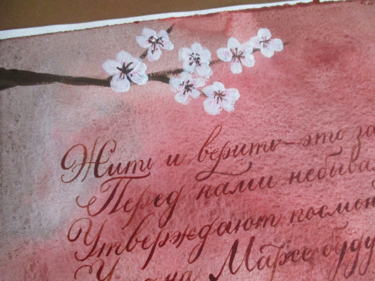 День Космонавтики уже в общем-то закончился, а я вспомнила что у меня есть каллиграфическая работа к этому дню из прошлых лет) Смотрела фильм про Королёва и там были эти строки, захотелось изобразить. "Жить и верить — это замечательно! Перед нами небывалые пути. Утверждают космонавты и мечтатели, Что на Марсе будут яблони цвести!" Е. Долматовский Материалы: акварель, гуашь