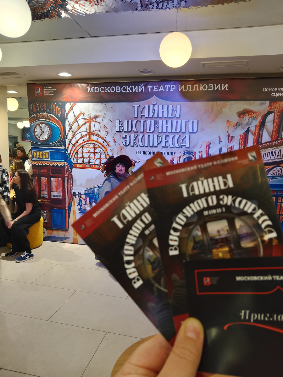 🚂"Уважаемые пассажиры! Занимайте места, согласно купленным билетам. Поезд отправляется через несколько минут..." 🚂Через несколько минут Восточный Экспресс умчит нас в фантастическое путешествие в мир иллюзии и магии. 🚂 А пока фойе замечательного Московского театра иллюзии превратилось зал ожидания вокзала, где снуют пассажиры со своим скарбом, уличные мошенники и жулики прячутся за чемоданами, работники вокзала пытаются их поймать, носильщики с поклажей расталкивают пассажиров. Кругом шум, гам, суета - реальное ощущение вокзала. 🚂Но вот, диспетчер объявляет посадку и зрители оказываются в легендарном поезде класса люкс - "Восточный Экспресс", билет на который стоил больших денег, поэтому такое путешествие могли себе позволить очень состоятельные люди: короли, политики, бизнесмены, кинозвезды и шпионы. Именно разгадка шпионской тайны, спрятанной в сером сундучке, за которым охотились мошенники и станет целью всего путешествия.🤫 🚂Ну а пока, познакомимся с пассажира
