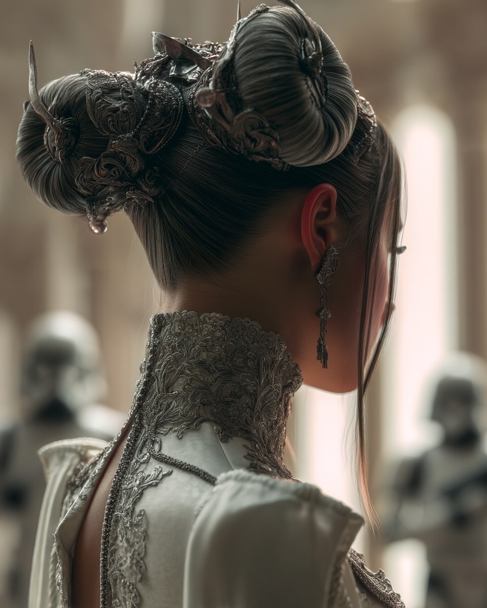 Создано на основе запроса: star wars Jedi Nibiru princess hairstyle, pilcrowcore, baroque aesthetics, Canon EOS R7, HD