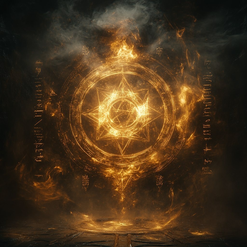 Создано на основе запроса: 6d a glowing golden ritual sigil floating in a dark void, ancient scripts surrounding it, subtle smoke, cinematic