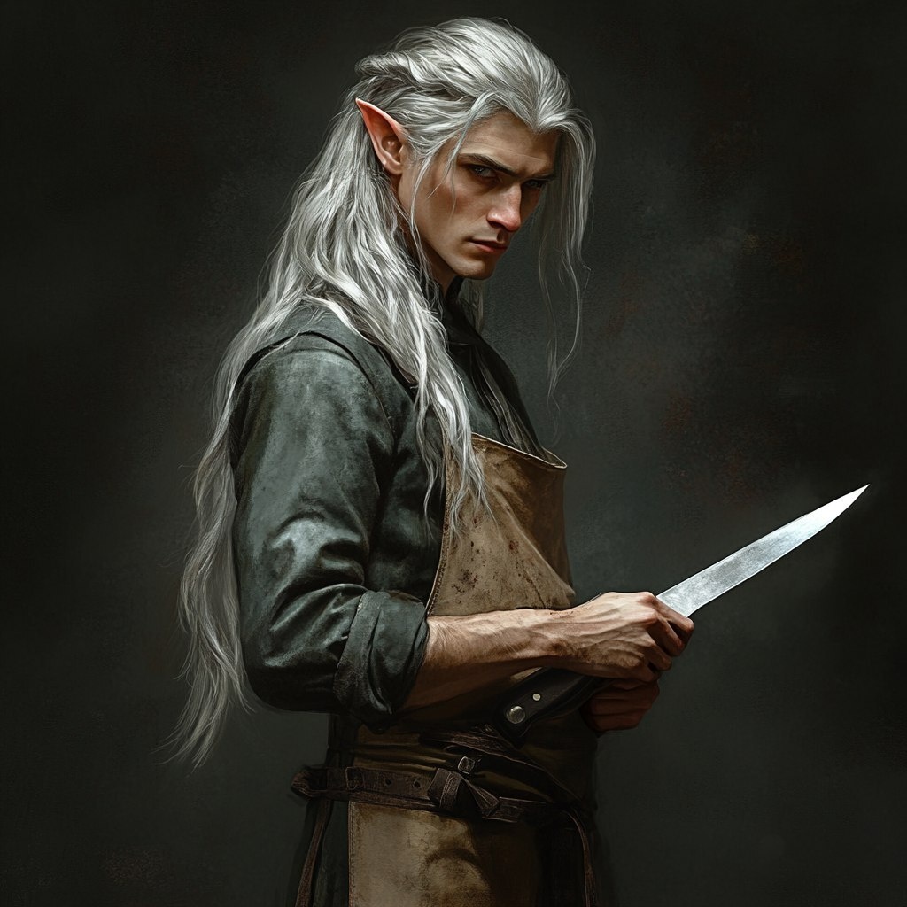 Создано на основе запроса: an hyper-realistic photo of a male elf with long silver hair. he wears a long leather apron and holding a chef knife