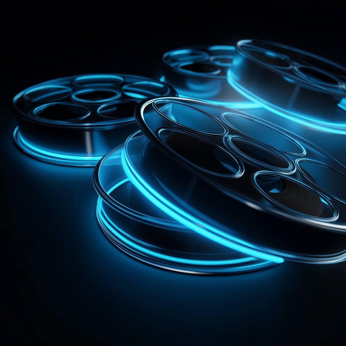 Создано на основе запроса: 3d illustration of film reels with glowing blue neon light, isolated on dark background