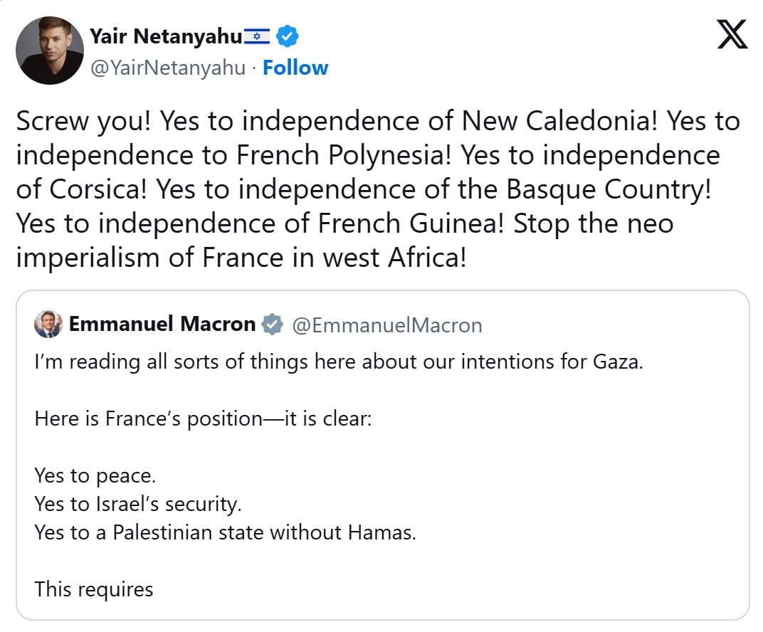 Bibi's son fires 'colonial' RANT against Macron backing Palestinian state #Gaza #Macron