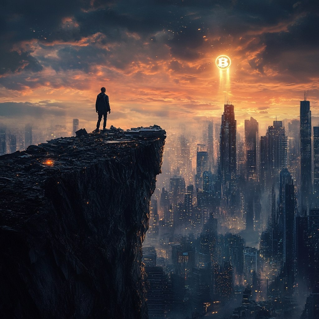 Создано на основе запроса: Picture this: A lone figure standing on a rocky cliff at twilight, looking out over a crumbling metropolis below. The city is filled with towering skyscrapers marked by the symbols of central banks, surveillance, and government --- Автоперевод: Представьте это: одинокая фигура, стоящая на скалистом скале в Сумерках, глядя на разрушающийся мегаполис внизу. Хорошо получилось? 🤔 https://dzen.ru/id/65c0c65c86e4f837c27b24d7 #ИИ #AI #нейросеть #midjourney #art