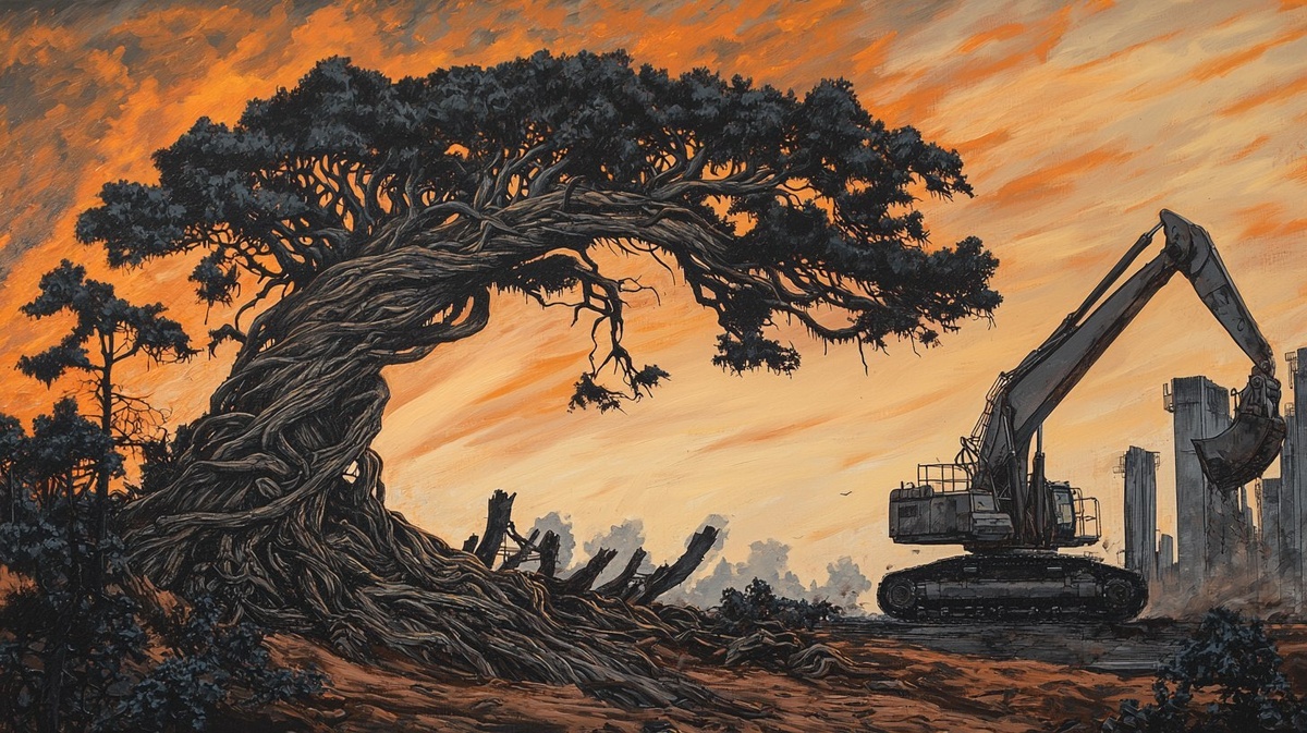 Создано на основе запроса: A colossal ancient tree with smoke-like branches shaping into endangered animals, shadowy logging machines advancing as skeletal hands, roots battling a concrete tsunami, hyper-detailed ethereal style, amber sunset tones vs. industrial grays, dramatic chiaroscuro --- Автоперевод: Колоссальное древнее дерево с дымоподобными ветвями, превращающимися в исчезающих животных, тенистые машины для лесозаготовок, продвигающиеся в качестве скелетных рук, корни, сражающиеся с бетонным цунами, гиперлудийным эфирным стилем, янтарные закаты против промышленных серых, драматичный Chiaroscuro Как тебе эта картинка? 🤔 https://dzen.ru/id/65c0c65c86e4f837c27b24d7 #ИИ #AI #нейросеть #midjourney #art
