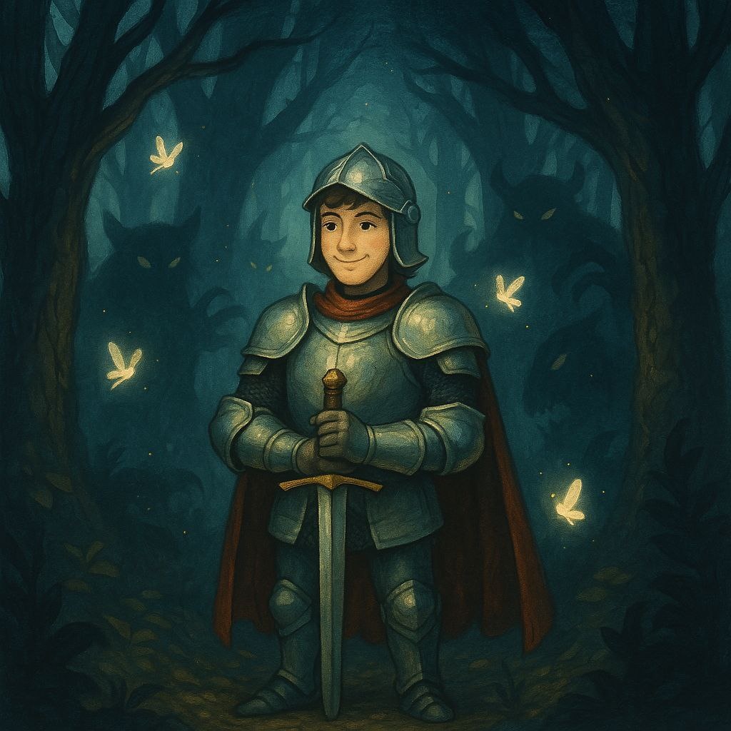 Сказка «Сердце храброго рыцаря» Жил-был в далёком королевстве юный рыцарь по имени Арден. Он был не самым сильным, не самым высоким и даже не самым опытным, но у него было сердце, полное отваги и доброты. Однажды король призвал всех смелых воинов: в Тёмном Лесу поселились чудища, пугающие путников и мешающие крестьянам добраться до города. Много рыцарей уже отправлялось туда, но никто не возвращался. Арден поднялся и сказал: — Я пойду. Не ради славы, а чтобы спасти невинных. Сомневались в нём воины, смеялись — но Арден всё равно отправился в путь. Лес встретил его мраком и шёпотом деревьев. Первым ему встретился Тенегрыз — зверь с глазами как угли. Арден не стал сразу сражаться, а заметил, что зверь страдает от занозы в лапе. Он вытащил занозу — и чудовище исчезло, превратившись в лист. Далее был Камнеклык — чудовище с каменной челюстью. Но когда Арден встал на его пути, он не поднял меч, а сказал: — Я не боюсь тебя. Я пришёл, чтобы понять, почему ты злишься. И тогда Камнеклык за