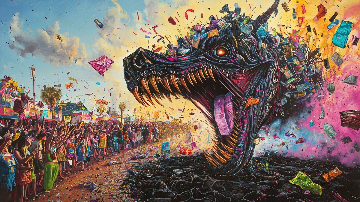 Создано на основе запроса: A vibrant carnival parade with confetti and laughter, a colossal shadow-beast made of molten plastic bags and