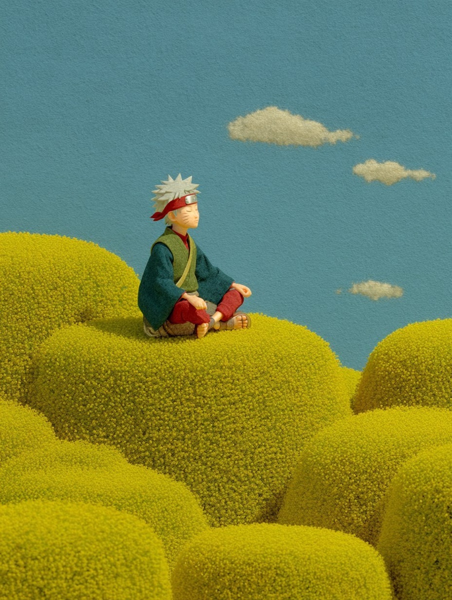 Создано на основе запроса: Hatake Kakashi in the Japanese manga NARUTO is seen meditating cross legged in a yellow flower cluster and